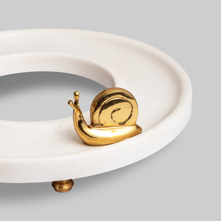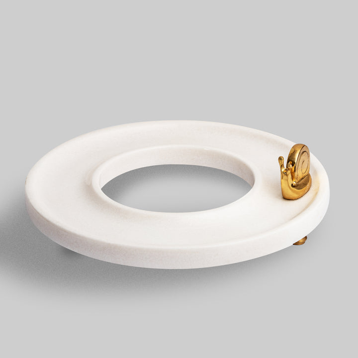 Inspired from the concept of infinity, ‘Cosmos platter’ is certainly one of our highly coveted accessories. Since the inception of ‘Topstone’ multiple versions of this platter have been introduced. Each version has been unique in its own way, carrying a quirky brass ornament and boasting a particular choice of stone. The recent version has been handcrafted in Ziarat white and carries a figure of snail modelled from pure brass.