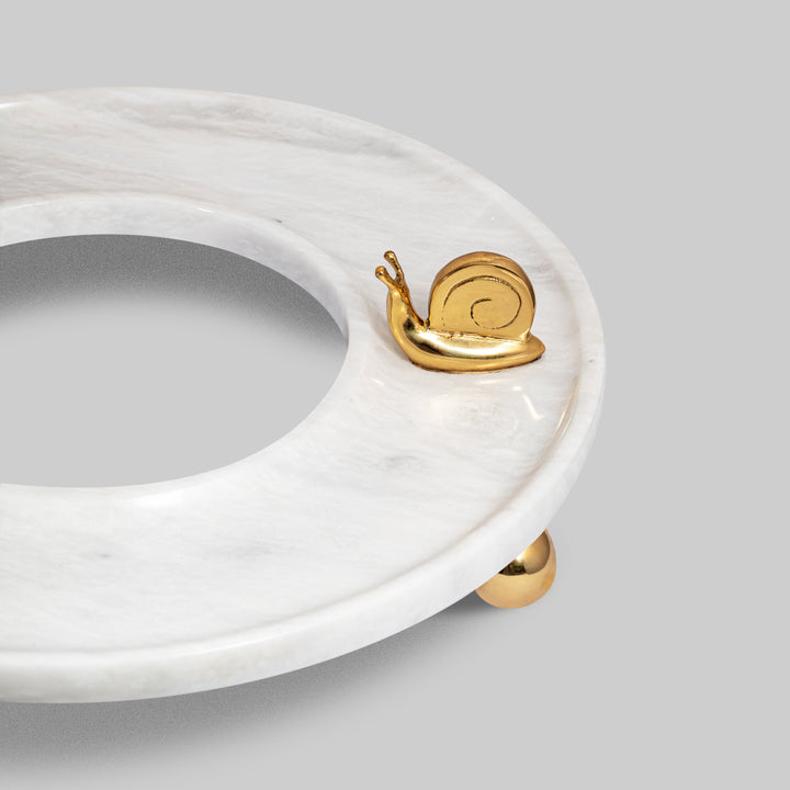 Inspired from the concept of infinity, ‘Cosmos platter’ is certainly one of our highly coveted accessories. Since the inception of ‘Topstone’ multiple versions of this platter have been introduced. Each version has been unique in its own way, carrying a quirky brass ornament and boasting a particular choice of stone. The recent version has been handcrafted in Ziarat white and carries a figure of snail modelled from pure brass.