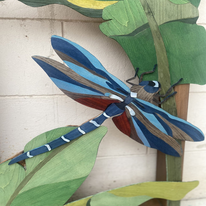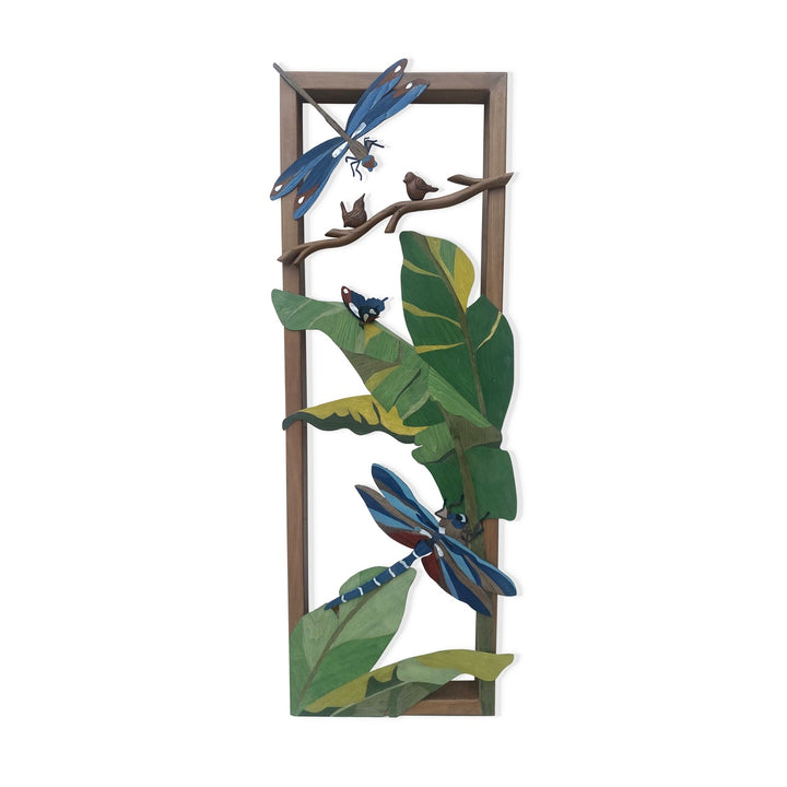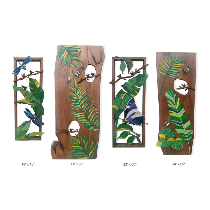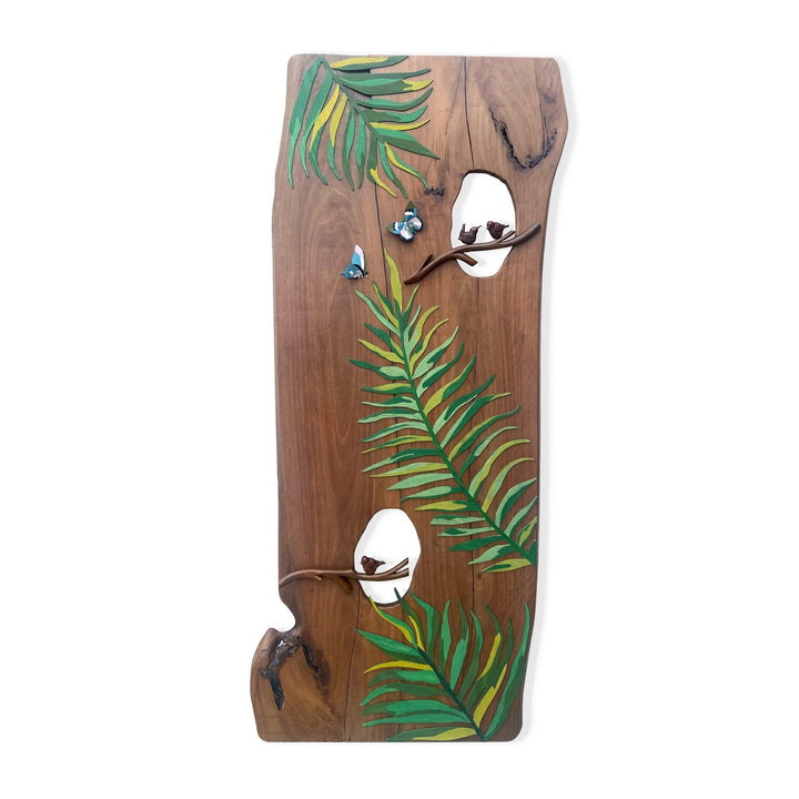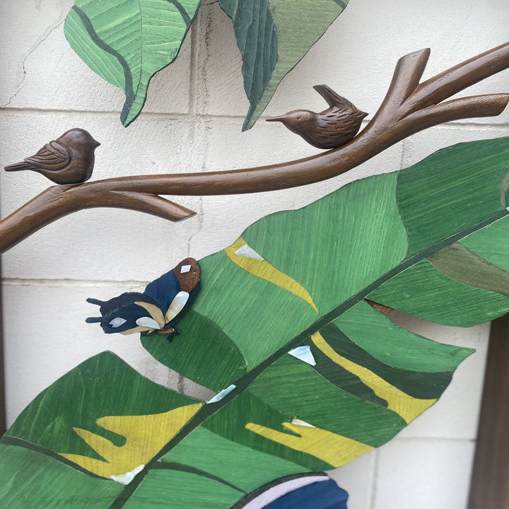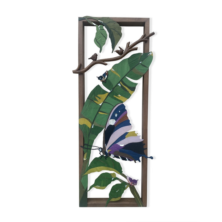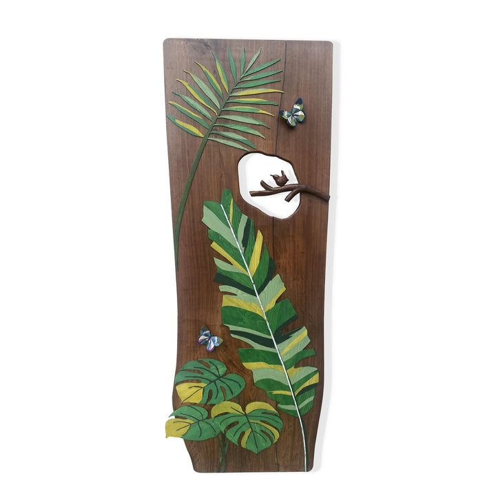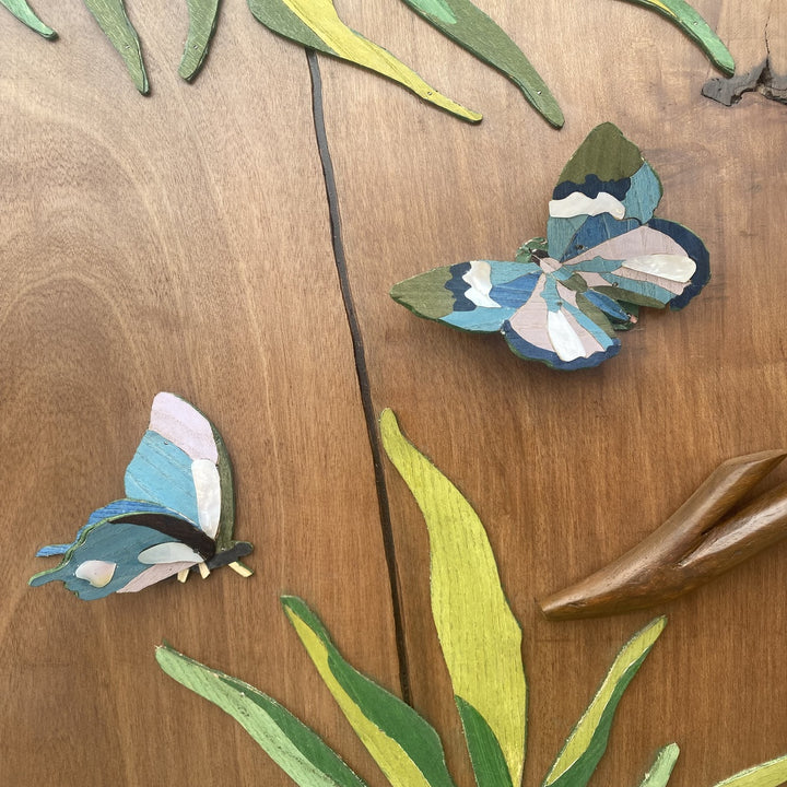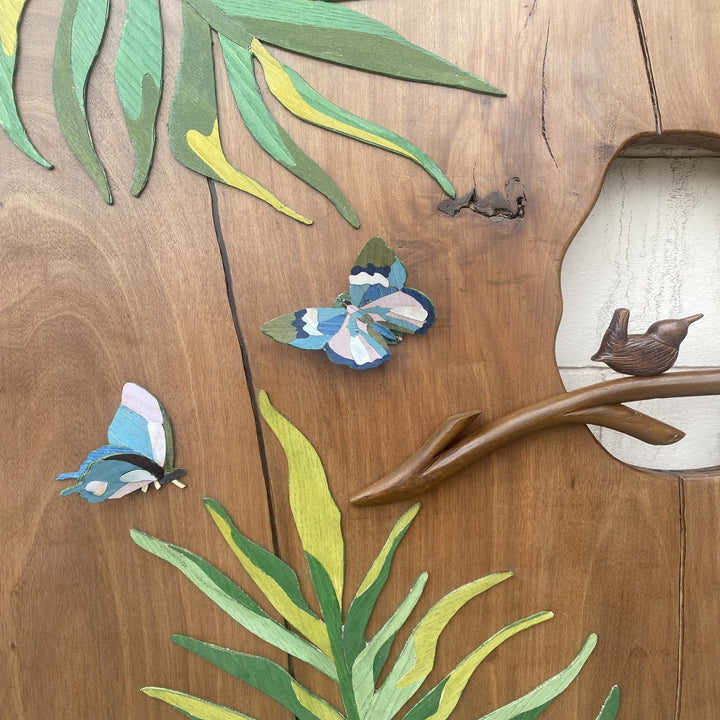Nayra’ is inspired from nature. The body of work consisting of four panels, incorporates organic forms, natural materials and realistic depictions to convey the unparalleled beauty of natural world. This custom designed work has been created using timeless technique of ‘Marquetry’ complemented by mother of pearl, hand-carved wooden elements and three-dimensional forms. Owing to the uniqueness of project, all materials applied in the process of making have been hand cut and manually assembled. More than thirty shades of natural as well as stained veneers have been combined to translate this vibrant vision into reality. Overlaying of mother of pearl has brought in an illuminated effect while adding to the textural richness of this work.