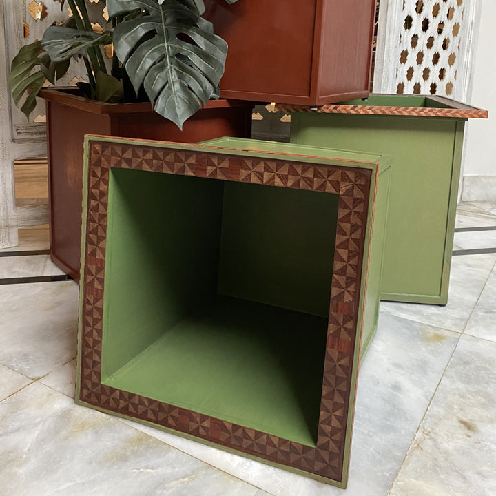 A simple and geometric form of this spacious planter has been adorned with marquetry bandings which adds to the bright and cheerful look of it. Bring the nooks and corners of your home alive by growing plants in these vibrantly colored planters. These indoor planters can also be used as presentable storage boxes in your study.