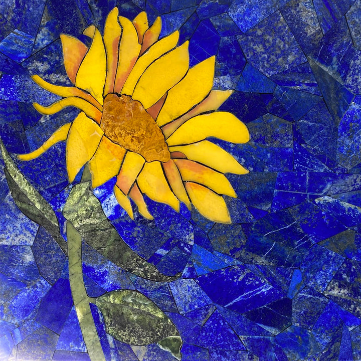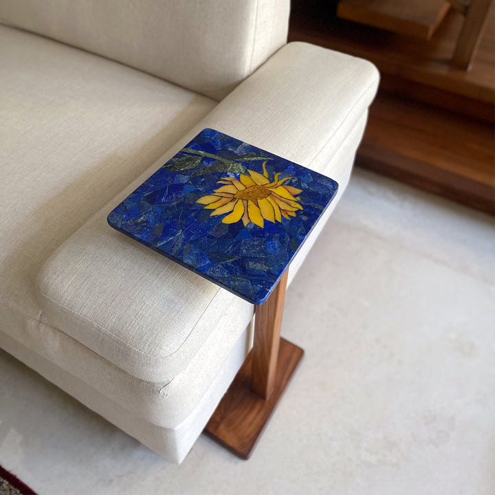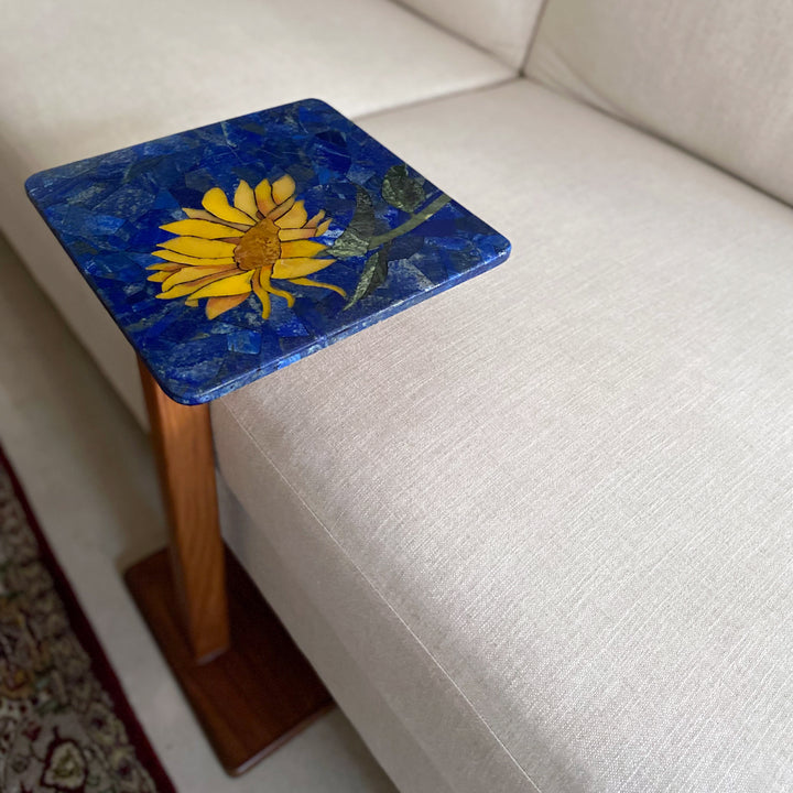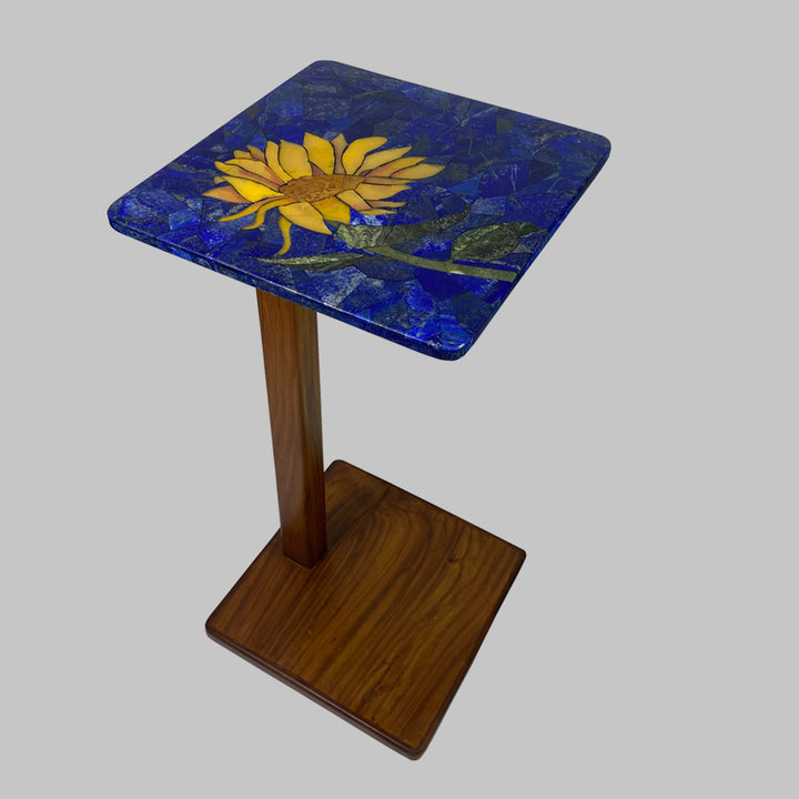 This work represents our passion for natural, semi-precious stone. A detailed, handcrafted mosaic motif with vibrant yellow petals set against a deep hue of lapis lazuli creates a striking contrast. Minimal and sleek wooden base facilitates practicality besides making it a perfect statement piece for living rooms, bedrooms, or reading nooks.