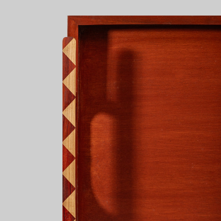 ‘Zeeneh’ boasts exquisite marquetry detail on handles. Three different varieties of natural wood have been used by our artisans to create these intricate geometric patterns. Final touch of striking wood stain enhances the bold appearance of this work.